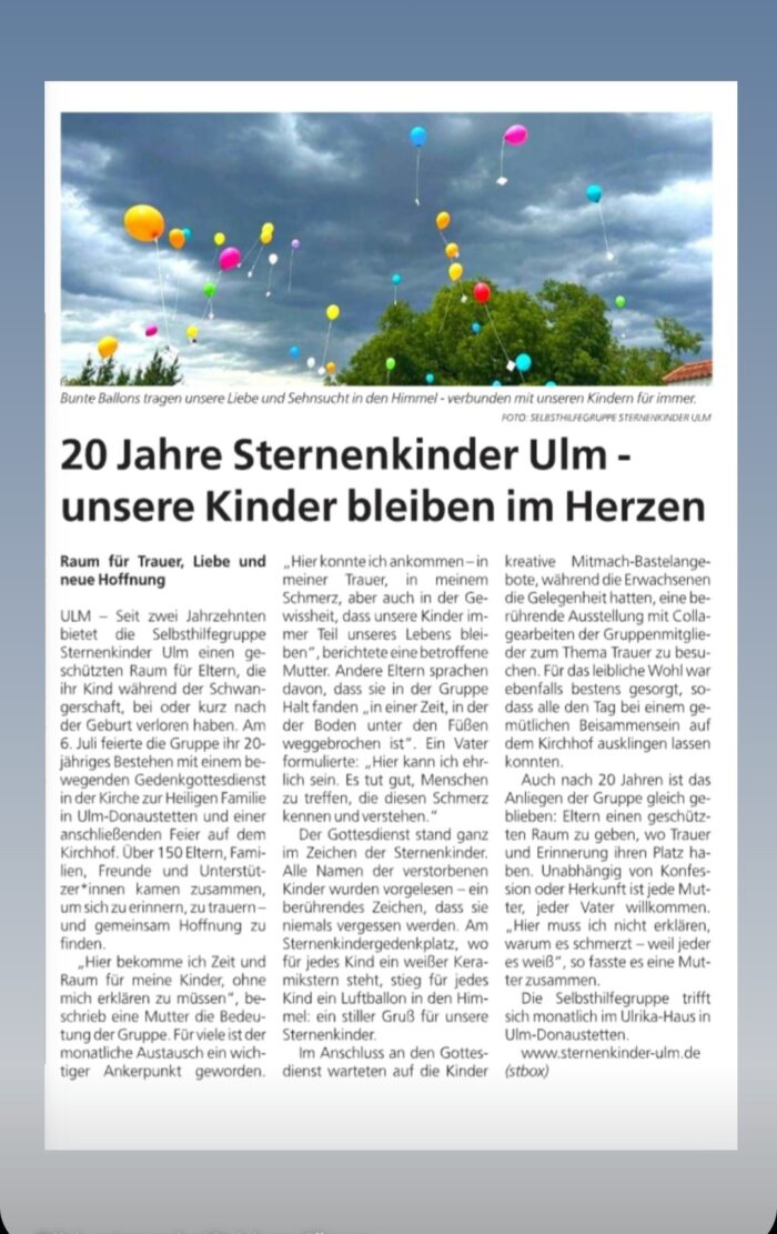 Seit 20 Jahren ist die Selbsthilfegruppe Sternenkinder Ulm ein Ort, an dem Trauer Raum haben darf und Erinnerung lebendig bleibt. Im Sommer 2025 durften wir dieses besondere Jubiläum gemeinsam begehen – in Dankbarkeit für den zurückgelegten Weg und in Verbundenheit mit unseren Kindern und untereinander. Der folgende Zeitungsartikel gibt Einblick in unsere Arbeit und in die Kraft einer Gemeinschaft, die trägt und verbindet.